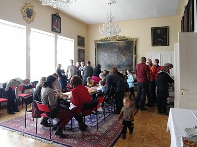 Setkání u kávy ve farní místnosti
