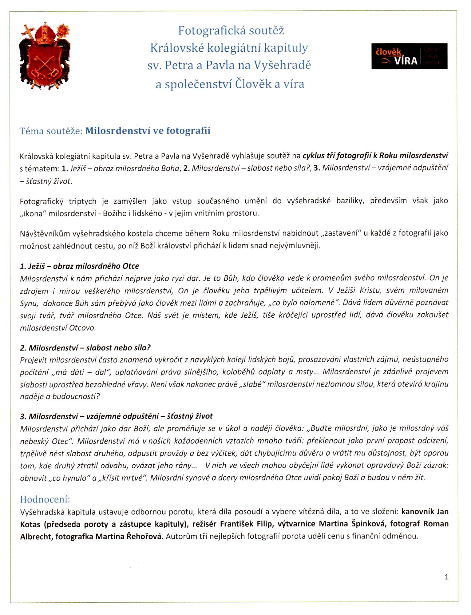 Královská kolegiátní kapitula sv. Petra a Pavla na Vyšehradě vyhlašuje soutěž na cyklus tří fotografií k Roku milosrdenství s tématem: